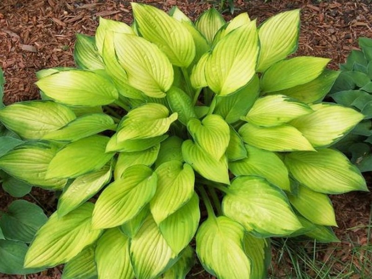 Хоста Gold Standart - растение среднего размера. Весной листья светло-зеленого цвета с темно-зеленой каймой по краю. Затем центр листа становится золотистым, и хоста приобретает более яркую окраску. Яркость зависит от количества солнца. При полной освещенности золотистый превращается в почти белый. Цветки - светло-лавандовые. Нарастает Gold Standard довольно быстро.
